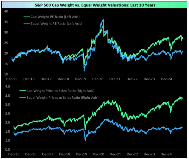 The valuation gap inside the S&P 500 is still wide🚨 Cap-weighted stocks remain expensive, while the average stock is trading at far more reasonable multiples than in 2021. That suggests breadth is improving, even if index-level valuations look stretched.