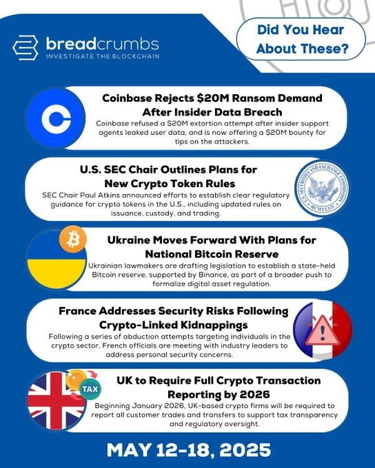 What do Coinbase, the U.S. SEC, and the French Interior Ministry have in common? They were all in last week’s biggest crypto headlines. From insider breaches to Bitcoin reserve plans, here’s what you might’ve missed ⬇️ #KneadToKnow #WeeklyRecap #BreadcrumbsApp