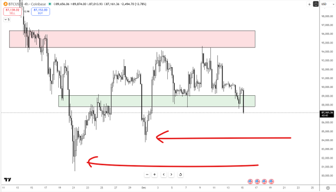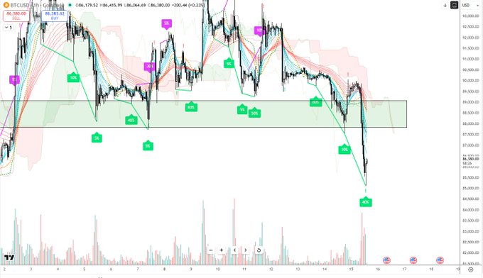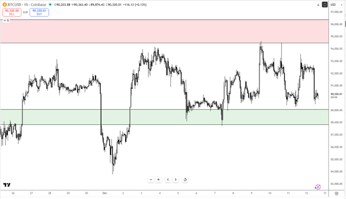 I was biased for a higher high and higher low since the crash to 80k (which more or less played out) but seems we have now stalled and evolved into good ol' fashioned BARTs in a wide range. Don't be quick to be shaken out on every "scary" move that often are fakeouts to trigger stops. BARTs often occur after most organic retail have left or are sidelined and larger players are using both sides of the range to fill/exit size rather than drive a directional trend, and often show up in bottoming processes and can go on for a while. However they could still be potential distribution processes instead of accumulation as the macro downtrend still is clearly bearish unless we can definitively claim above the $95k area, preferably above $100k (which will be very tough imo). They cluster when price is stuck around a key pivot (here: ~88-90k) with clear supply above (~93.5-96k). Here's how to trade around this crap: Define your range: Support/demand: 88–90k Resistance/supply: 94–96k Long idea (fade BART dumps): -Wait for a flush below 89–90k that closes back inside the zone. -Enter on the reclaim, not during the nuke. Invalidation: just below the sweep low. Targets: 91–92k and 93–94k, optional runner toward top of box. Short idea (fade BART pumps): -Wait for a spike into 93.5–96k that leaves wicks / lower highs. -Enter on rejection, not mid-pump. -Invalidation: above the wick high. -Targets: 91–92k and 89–90k. When this playbook stops working: -H4/D1 closes and holds (not wicks) below ~88–89k -> stop buying the bottom of the box, respect potential downside trend. -H4/D1 breaks and holds (not wicks) above ~93.5–94k -> stop shorting every pop, look to buy pullbacks instead. Until one of those breaks sticks, treat BARTs as a signal to fade extremes in a defined range, not as a trend signal.