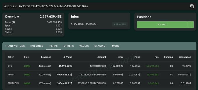 BIG BULLISH??? New wallet (0x93c5) dropped 2.5M $USDC on Hyperliquid They went max long $BTC, $PUMP, $FARTCOIN.