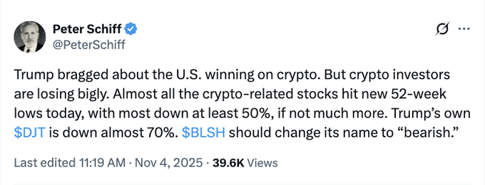 🚨 PETER SCHIFF: “Crypto investors are losing bigly.” He says nearly all crypto stocks hit new 52-week lows and Trump’s $DJT is down almost 70%.