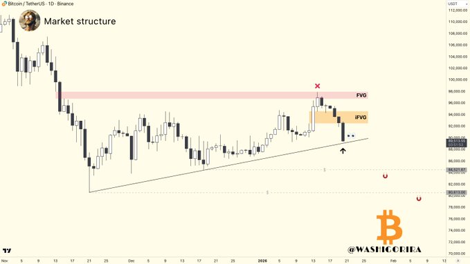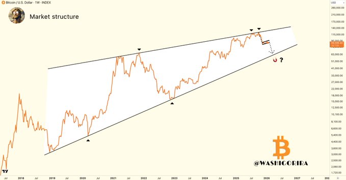 #Bitcoin Lower boundary of the multi-year rising wedge could act as a reasonable downside target, aligning with the bear flag currently forming.