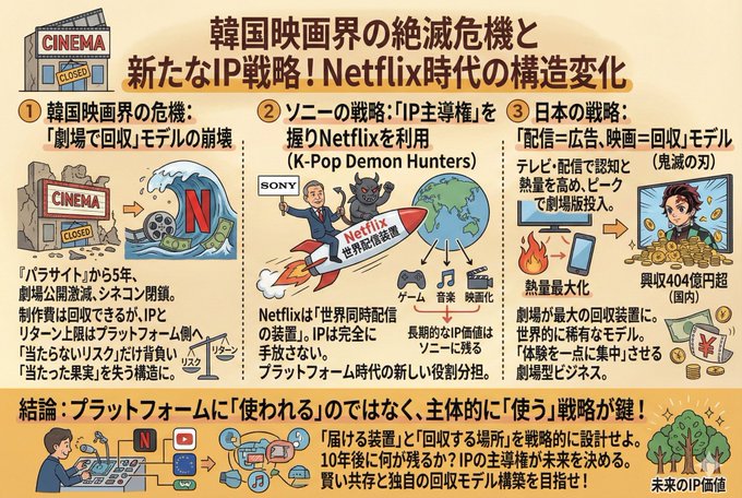 K-Pop Demon Hunters demonstrated the novelty of "using Netflix without giving up IP," while Demon Slayer demonstrated the novelty of "turning streaming into the largest promotional device and recovering revenue in theaters." Neither is the traditional film business nor a model that Netflix completely dominates.