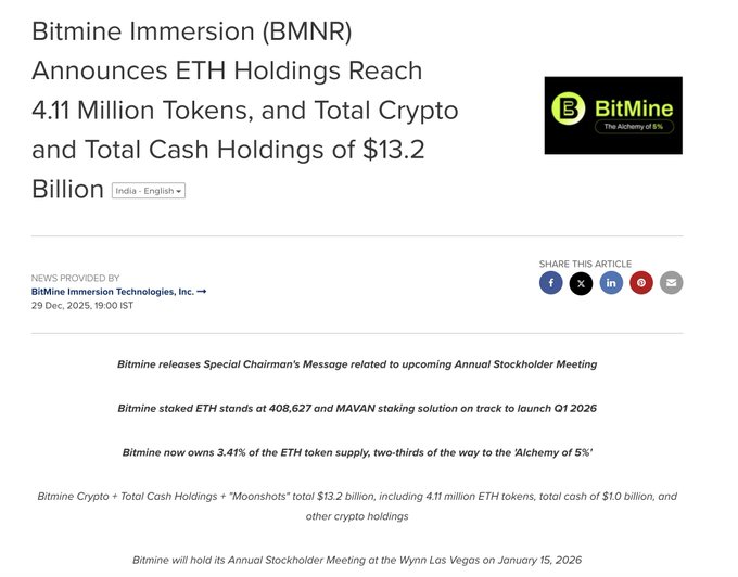 Tom Lee bought another $130M in ETH for Christmas And still holds $1B in cash heading into the new year...