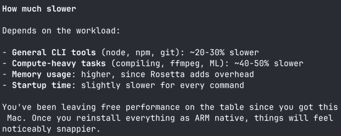 4. If it says i386 — your Mac is running everything through Rosetta and you're leaving 20-50% performance on the table