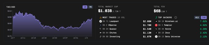 @Bittensor Subnets Market Cap is back above $1bn. 📈 With a $6bn Total FDV, the room for subnet growth remains massive. Most subnets have bounced from their early-Dec lows, showing strong recovery as TAO climbs back from the $210 floor.