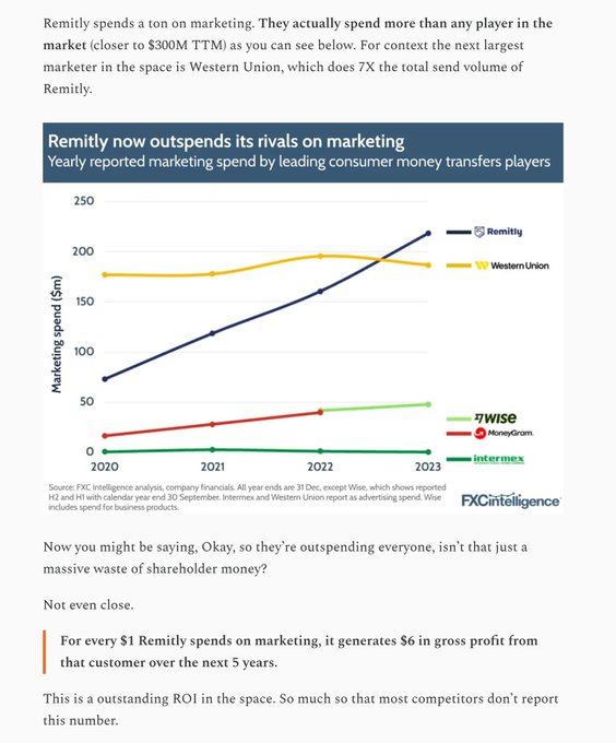 Remitly $RELY has been outspending its competition by a mile in marketing. And the market has punished it for doing so. Treating the spend like a black hole. However, Remitly has proven that it can generate 6x the marketing spend per customer in direct gross profit over 5 years.