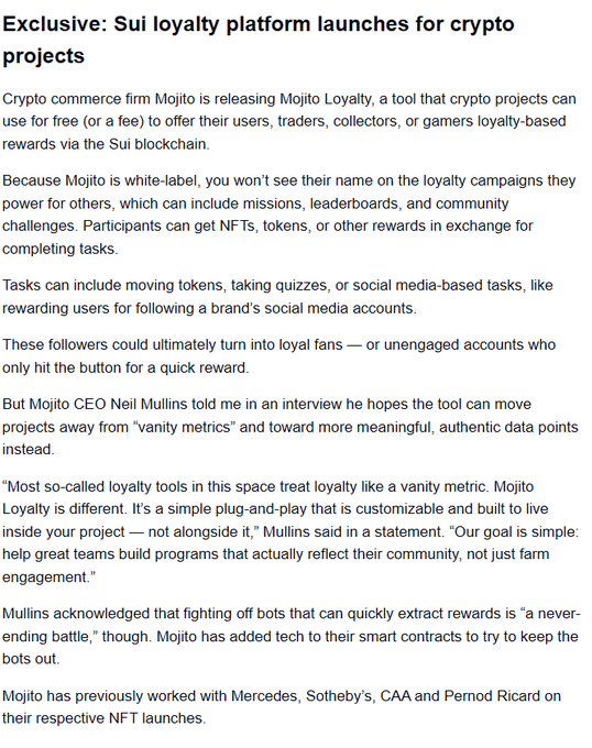 Exclusive: Mojito is releasing Mojito Loyalty, a tool that crypto projects can use for free (or a fee) to offer their users, traders, collectors, or gamers loyalty-based rewards via Sui.