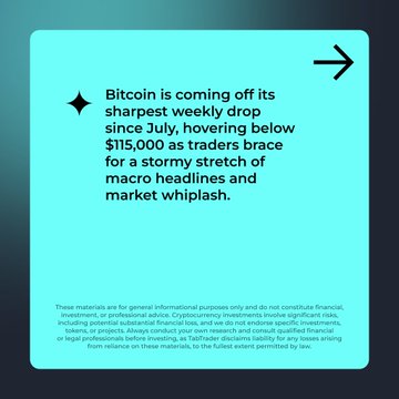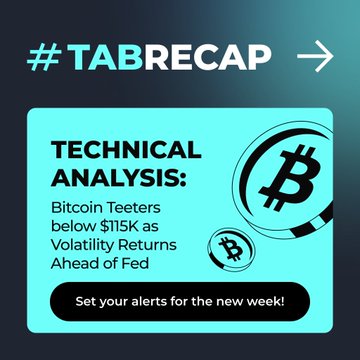 1/ #TabRecap | BTC’s taking a breather below $115K after a volatile week. Here’s what traders are watching 👇 Price cooling after a 9% weekly drop 🔹 Above $116.9K → momentum shift 🔹 Below $109K → risk of deeper correction 📅 Macro triggers: Fed updates + inflation data
