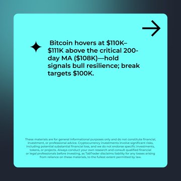 #TabRecap | BTC’s Make-or-Break Zone 🧵 📊 BTC’s trading between $110K–$111K, hanging just above the 200-day MA ($108K) 📉 RSI (39–51) and a bearish MACD crossover confirm seller control 🌍 U.S.–China tariff headlines sparked a risk-off move, pushing BTC lower while gold rallied