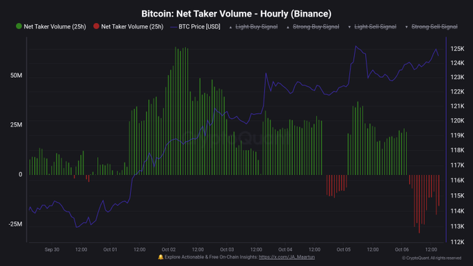 Unusual divergence alert โ ๏ธ Bitcoinโs price is grinding higher yet Taker Sell Volume is dominating buys.