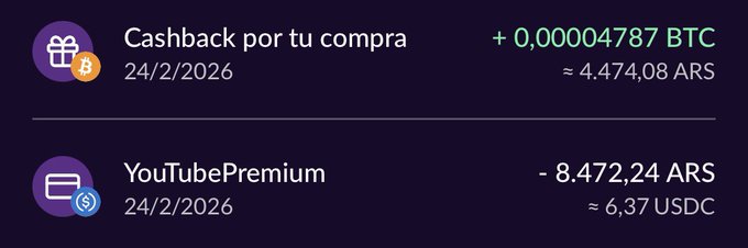 Paying for YouTube Premium with the @RipioApp Card 💳 -8,472 ARS (taxes included) +50% cashback in Bitcoin 🟠 I'm choosing BTC, but it can also be ETH or USDT.