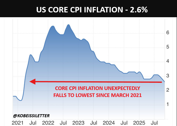 What just happened? Core CPI inflation in the US just unexpectedly fell to 2.6%, its LOWEST level since March 2021. 3 months ago, inflation rose to a 6-month high, and last month, the October CPI inflation report was "cancelled." What changed? Let us explain. (a thread)