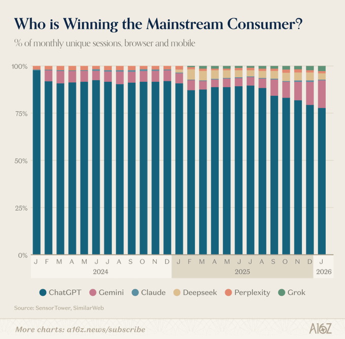 .@a16z DROPS ITS 6TH ANNUAL TOP 100 GEN AI APP LIST > ChatGPT still dominates with 900M weekly users, but Claude grew paid subscribers 200%+ YoY as a two-platform AI war takes shape > The AI market is splitting into 3 global ecosystems (Western, Chinese, Russian), and the US ranks just 20th in per-capita AI adoption > Agents are the next frontier, #Claude Code hit $1B ARR in 6 months & OpenClaw became GitHub's #1 most-starred project before being acquired by OpenAI