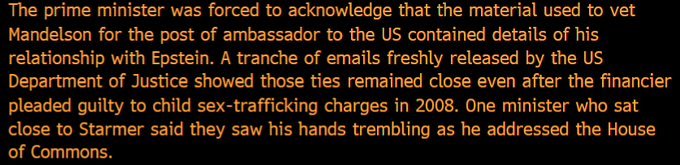 So the UK Prime Minister appointed Mandelson as US ambassador, knowing he was buddies with Epstein. Meanwhile, they arrest people in the UK if they tweet something "wrong". Reminds me of Animal Farm, but that's insulting the pigs.