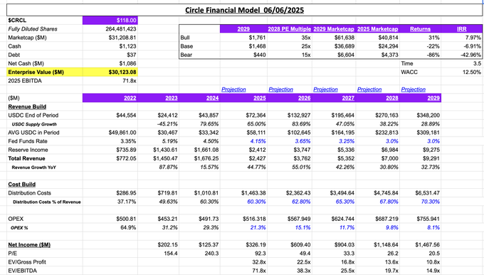 Circle at ~$118/share makes it more challenging for Circle's upside. Here's our financial model. Going to add upside with CPN and take rate there. I'm sure I'm midcurving this 🤣
