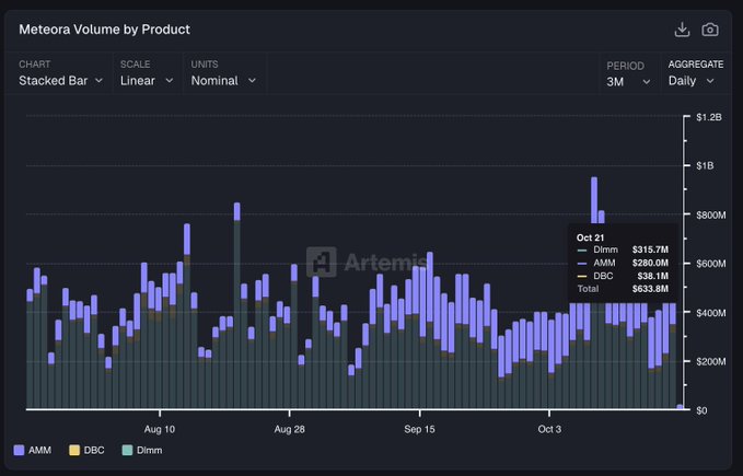 Metrics that matter for @MeteoraAG on TGE day 1. Meteora daily volume: $633m +13% MoM 👉Most volume from Dynamic Liquidity Market Make 2. Meteora daily fees: $4.5M +309% MoM 👉Most fees comes from LPs 3. Meteora daily revenue: $579k +366% MoM 👉Annualized revenue is $170m+
