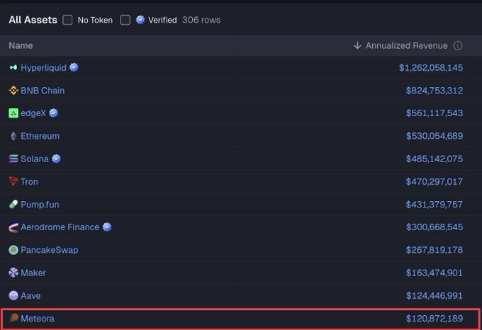Meteora $MET is a top 12 token by annualized revenue at $120M/year Congrats @0xSoju @0xevanarp and @MeteoraAG team.