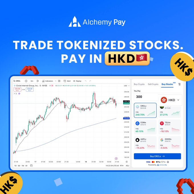 💸 🇭🇰 HKD is now your gateway to tokenized equities. Now you can use HKD to buy hot tokenized stocks like Circle, Apple, and Tesla via #AlchemyPay. Fiat-first investing—because it should've always been this simple. $ACH