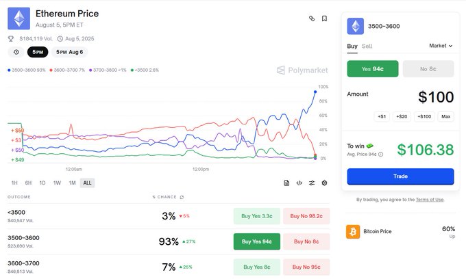 Polymarket traders betting on a 90%+ chance that ETH stays in the 3500-3600 range for the next few hours🧠 You can sell 100x leverage calls on IVX for the same experience where you would profit from ETH ranging while everybody else would be betting on Volatility‼️ Carpe Diem 🪃
