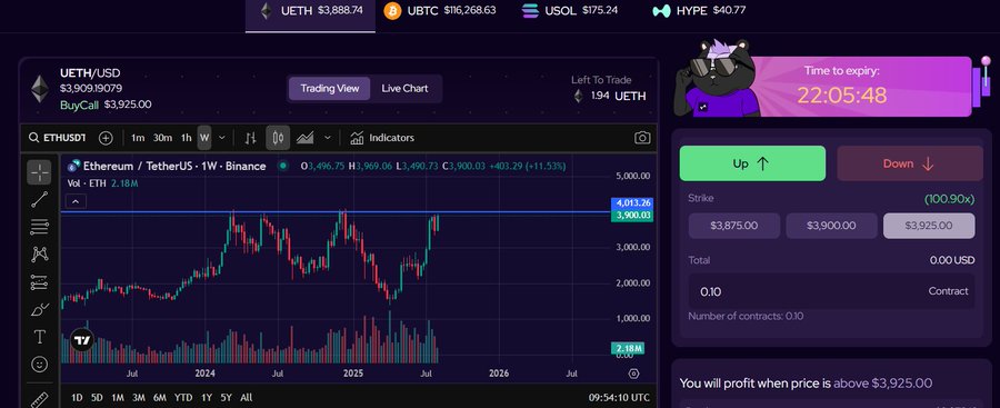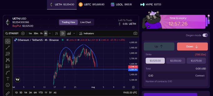 Unemployment data in 1 hour 📊 Cryptocurrency to be allowed in 401ks 🪙 $ETH back above 3800 and looks primed to make new highs again 🟢 This calls for 120x leverage $ETH "UP" Calls with full protection against liquidation 📈 Carpe Diem 🪃 twitter.com/ivx_fi/status/1953...