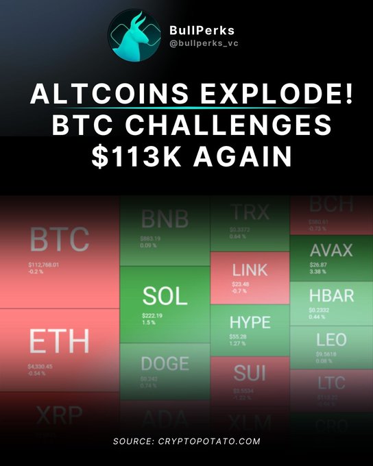 Bulls, check this out! Altcoins are surging with huge pumps, and BTC is charging at $113K once more. Time to dominate the market! Source: @Crypto_Potato #cryptocurrencies #bitcoin #altcoins #bullrun #marketwatch