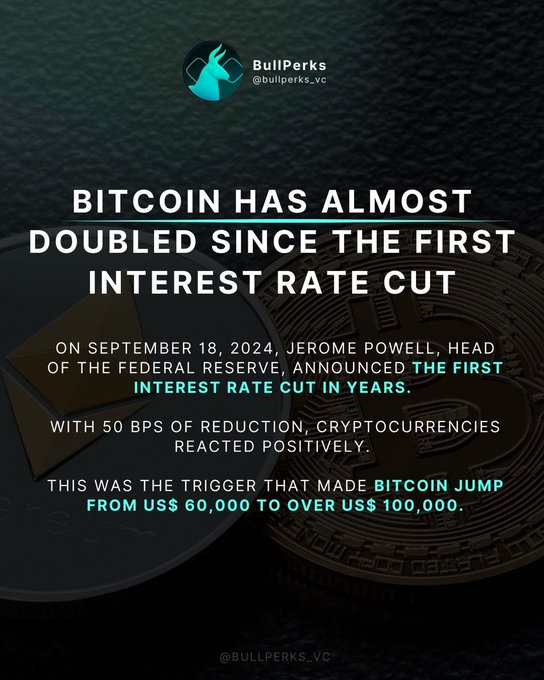 $BTC nearly doubled since the first Fed rate cut in 2024! 📈And with a new cut in sight, the question is: will we repeat the feat? #Bitcoin #FedRateCut #CryptoBoom