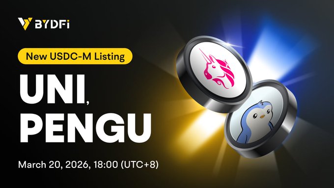 📣 BYDFi Listing New Perpetual Contract Trading Pairs ⏰ Trading Starts: 2026/03/20 18:00 (UTC+8) 👉 USDC-M Trading Pairs: $UNI/USDC , $PENGU/USDC @pudgypenguins 🔥 Trade Now:bydfi.com/en/swap?id=uni-usdc…