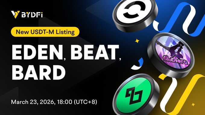 📣 BYDFi Listing New Futures Trading Pairs ⏰ Trading Starts: 2026/03/23 18:00 (UTC+8) 👉 USDT-M Trading Pairs: $EDEN/USDT (), $BEAT/USDT , $BARD/USDT @OpenEden_X @Audiera_web3 @Lombard_Finance 🔥 Trade Now: bydfi.com/en/swap?id=eden-usdt…