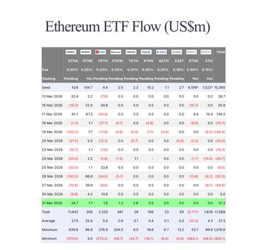 🚨JUST IN: 🇺🇸 Ethereum spot ETFs recorded a net inflow of $31.2M on March 31. BlackRock clients bought $24.7M worth of $ETH.🟢