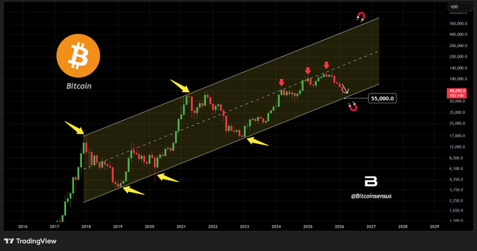 #Bitcoin Macro Channel Lower band on the brink of being retested 📈✅ If $BTC retests $55K this month or next month, there is a high chance that it finds a descent bottom around this zone. This support line dates from back in 2019