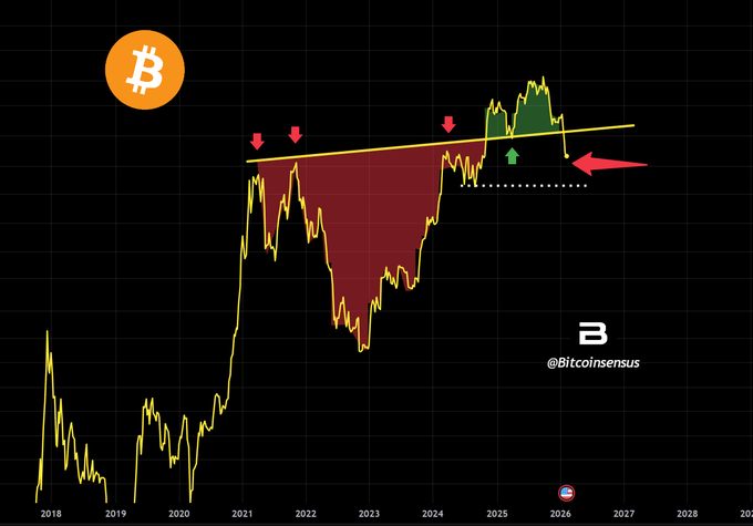 $BTC has already broken down from a major support neckline. Next level of support comes in at at $55K according to this simple line chart. 📊 #Bitcoin