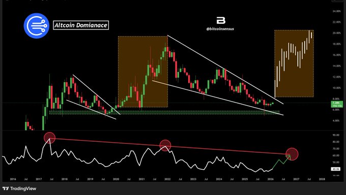 ALTCOIN DOMINANCE AT INFLECTION POINT 📊 Multi-year falling wedge nearing resolution 📉 Selling pressure weakening at key support 📈 RSI divergence hinting momentum shift Breakout favors a strong altcoin expansion phase. (NFA) #Altcoins #Crypto