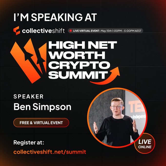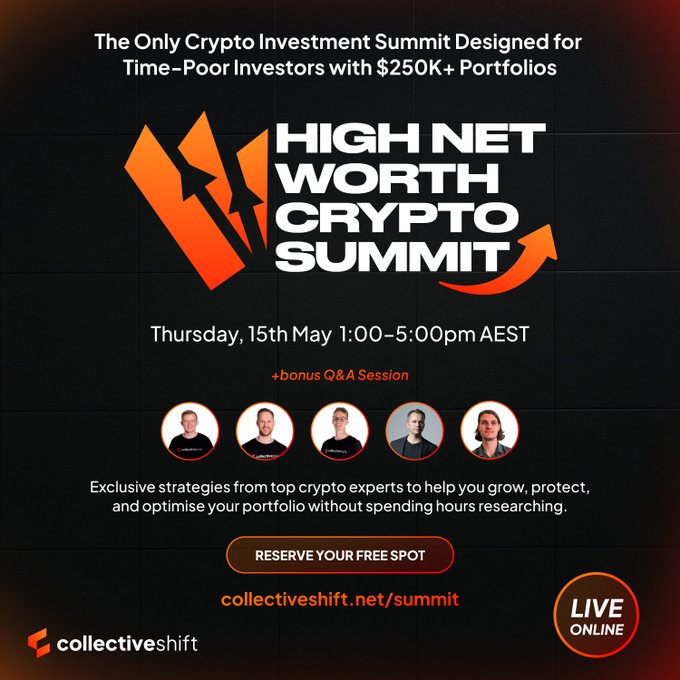 🇦🇺 Less than 24 hours to go. Make sure you're registered for the High Net Worth Crypto Investor Summit. 📅 Date & Time Thursday, May 15th 1:00 PM – 5:00 PM AEST This is an event you're not going to want to miss. http:/collectiveshift.net/summ...