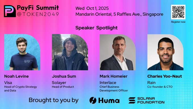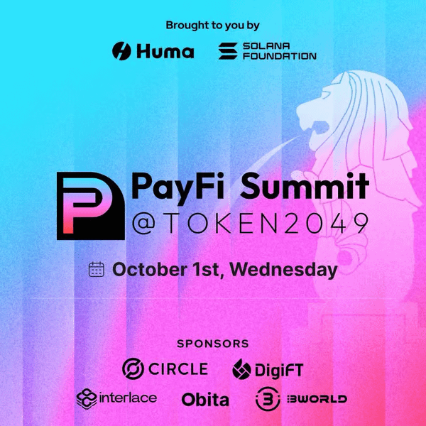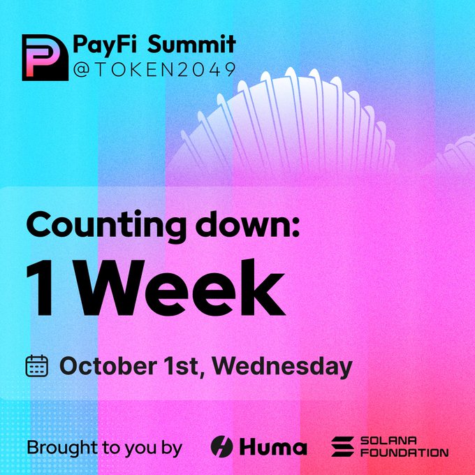3 days till PayFi Summit 🇸🇬 #TOKEN2049 Brought to you by Huma and @SolanaFndn. Supported by: - Gold sponsors: @Circle @DigiFTTech - Silver sponsors: @InterlaceMoney @Obita_offical @3WorldGlobal_ 📍 Oct 1 | Mandarin Oriental, Singapore