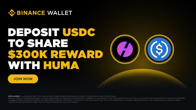 It’s official: Huma’s stable yield is now on @BinanceWallet 🔥 Deposit ≥50 $USDC into the Simple Yield Huma Pool: 🚀 Earn 10% base yield 🟣 Share $300,000 in $HUMA rewards 🔜 Get set for the next $HUMA airdrop Start now 👇 binance.onelink.me/kDFj/ns6iz6...… twitter.com/humafinance/status...
