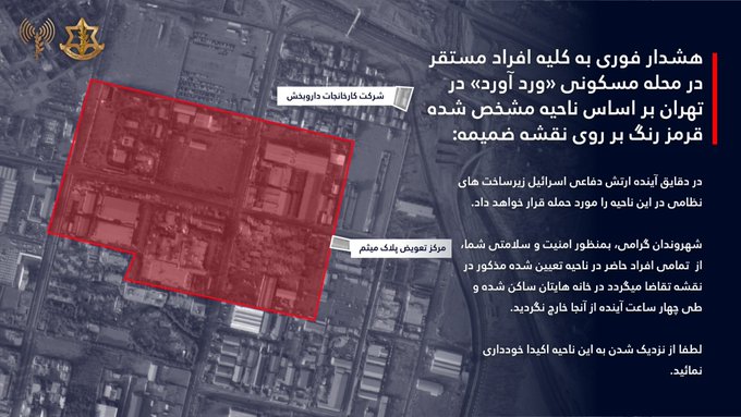 The Israel Defense Force has issued an urgent warning to residents of the Vard Avar Neighborhood in the Iranian capital of Tehran, stating that the Air Force is preparing to carry out strikes against military infrastructure in the designated area and residents are advised to remain in the their homes for the next four hours.