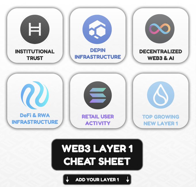 ⛓️LAYER 1 CHEAT SHEET If you want institutional trust, pick $HBAR If you want established DePIN utility, pick $FLUX If you want true Web3 decentralization, pick $ICP If you want DeFi & RWA infrastructure, pick $INJ If you want retail user activity, pick $SOL If you want a