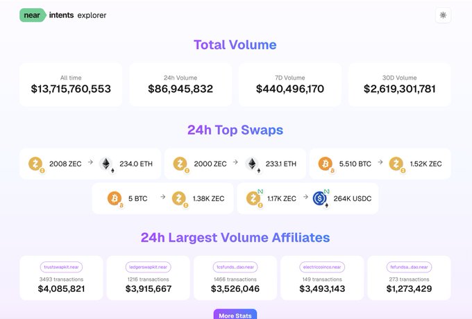 $NEAR Intents were rolled out Nov 2024 Since then we've seen over $13.5 Bil in all time volume across Intents. Now here's the kicker... In the past 30 days we've seen $2.619 Bil of that $13.715 Bil In other words, the past 30 days have made up ~20% of NEAR Intents total volume🤯 Probably nothing