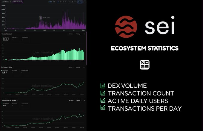 The on-chain metrics continue to look strong for $SEI ✅DEX volume $15 Mil+ per day average ✅Consistently rising transactions per day ✅Rising daily active users at all-time highs This is exactly what you want to see in a downturn market like this. Even with the price action, we continue to see demand and utility for Sei Network growing! This is proof that the ecosystem is organically sustaining and even showing signs of growth. If this is the network activity we see from Sei during a market downturn... Just imagine what happens when capital really flows back into crypto. Ecosystems like Sei are ones you want to find for both long term survivability but also strength in market dominance!