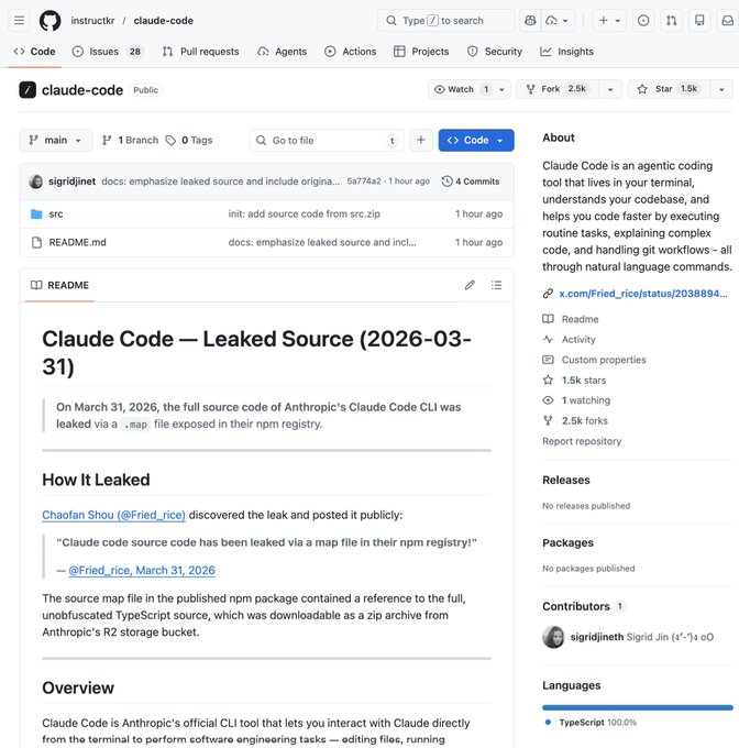 SOMEONE MADE A COPY OF CLAUDE CODE'S LEAKED SOURCE CODE ON GITHUB IT ALREADY GOT 9K STARS IN 2 HOURS! github.com/instructkr/claude-c...…