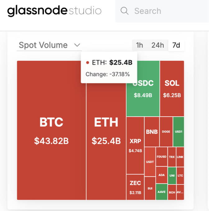 If you feel that crypto is a ghost town this week - you are not alone. $ETH's spot volume is down 37% in the last 7 days.. And $SOL spot vol? Down almost 43% People are touching grass I guess
