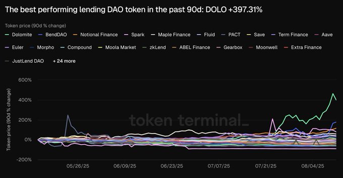 The "best performing lending DAO token in the past 90d" belongs to a protocol that has: 115 assets 5 supported chains $18B+ platform volume Built different. twitter.com/Dolomite_io/status...