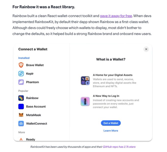 after speaking with @mikedemarais added a part about RainbowKit. good example of a channel called "engineering as marketing" where you build a product to promote your brand. in the era of vibecoding this channel should become way more popular. ps: anyone knows @bobbyong? would be interesting to share how they used SEO to grow CoinGecko twitter.com/MacBudkowski/statu...