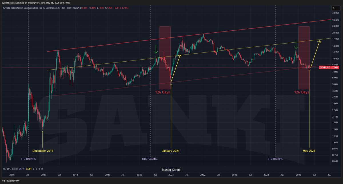 💡 The interesting thing is that in the previous cycle, we had a 126-day period of continuous decline before the altcoin season began. Now, we’ve also seen 126 days of declining OTHERS dominance. The position on the trendline is identical, at the bottom, which leads me to twitter.com/btc_MasterPlan/sta...