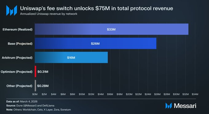 tomorrow, Uniswap faces its most pivotal economic milestone since v3 > $UNI holders are voting to extend the protocol fee switch to 8 new networks, with final approval expected tomorrow > the expansion could more than double $UNI holder revenue to $75M annualized > our estimates project $42M in new L2 revenue on top of $33M already realized on $ETH mainnet