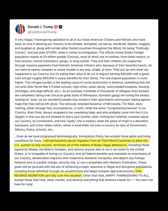 🚨 "I will permanently pause migration from all Third World Countries to allow the U.S. system to fully recover, terminate all of the millions of Biden illegal admissions... & remove anyone who is not a net asset to the U.S., or is incapable of loving our Country..." - @POTUS