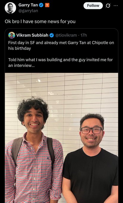 Meanwhile in San Francisco: random startup nerd thinks he ran into CEO of YCombinator at Chipotle, was actually just some random Asian guy. Random Asian guy apparently goes along with it. CEO of YCombinator breaks the bad news