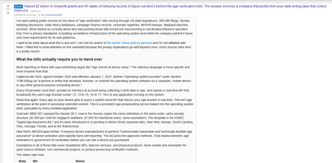 Yeah, so basically it turns out Meta has been heavily lobbying online age verification laws. They've lobbied over $2,000,000,000 to politicians in form of grants and donations. twitter.com/vxunderground/stat...