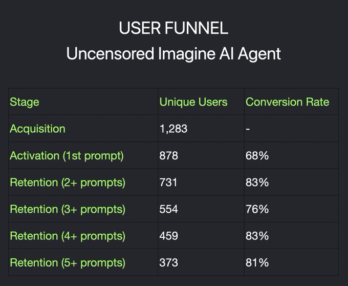 Weekly Plan: Double down on Uncensored AI Last week, Eternal AI was trending on Product Hunt. As a web3 product launching on a web2 platform, we felt pretty good about it. There is one CryptoAgent that absolutely stands out: Uncensored Imagine. Let's dive into its user funnel